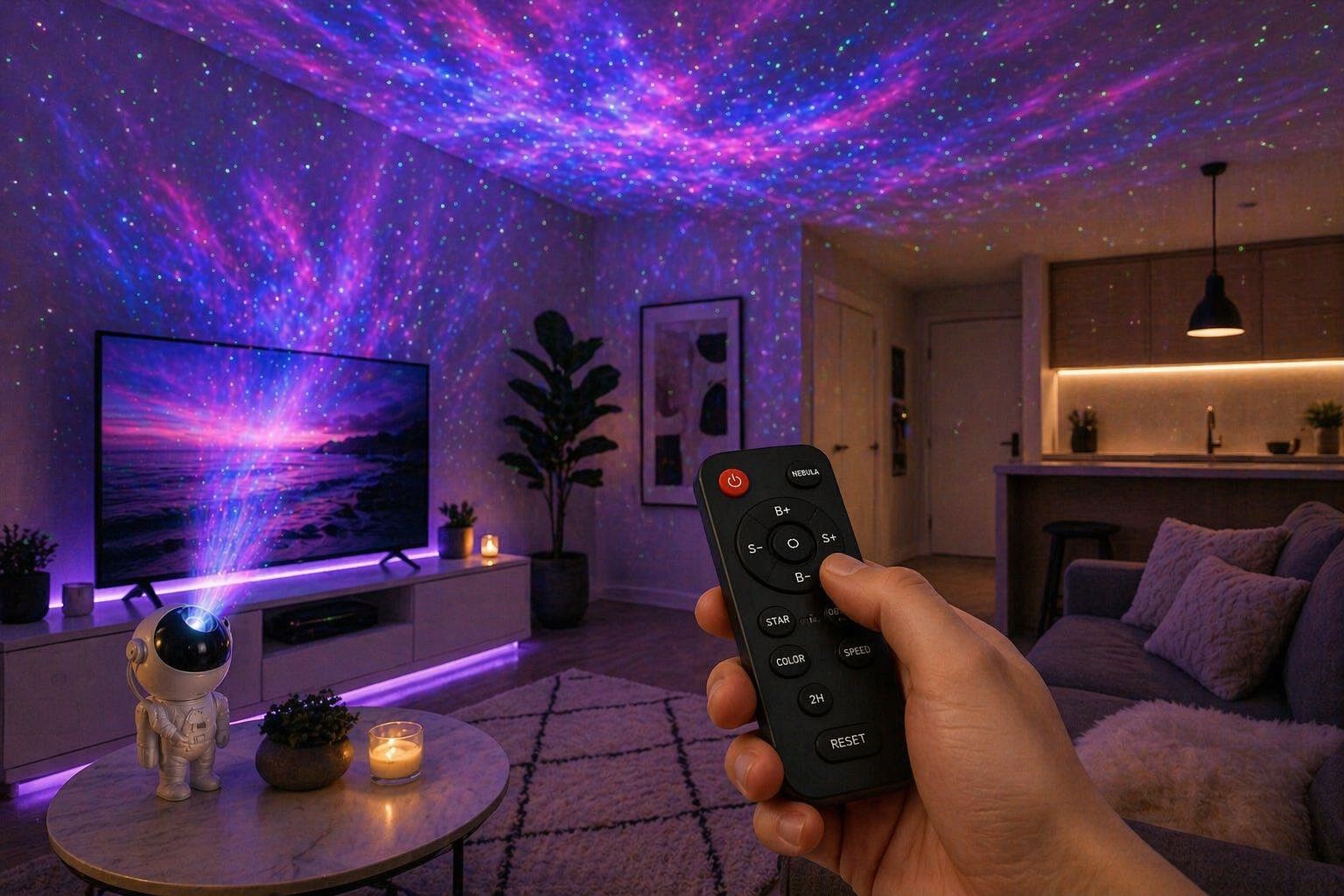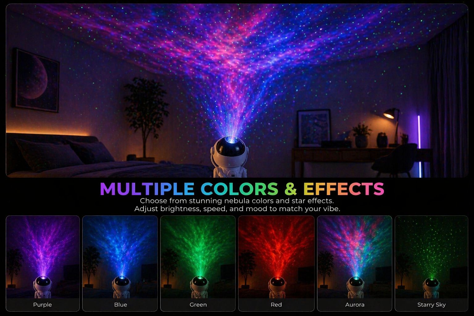 Choose from stunning nebula colors and star effects. Adjust brightness, speed, and create your perfect vibe instantly.